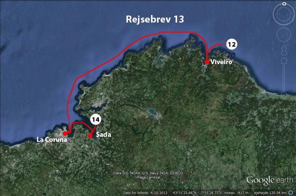 Viveiro var egentlig lidt svær at forlade. Vi var på toppen af San Roque, hvor vi havde en fantastisk udsigt over hele området i helt klart solskinsvejr. Og en dejlig middag på S/Y EOS hos nogle søde mennesker fra Enkhuizen fristede jo lidt til at sove længe, men nu ville vi videre mod La Coruna, som vi så ville se nærmere på allerede i år. Vi stod op til en lidt diset morgen, stille - og vi tøffede af sted, da skipper pludselig sagde:"Se lige!" Og i mellem to bjergkamme gav solen os en morgenhilsen, der var aldeles uforglemmelig! Måske det skyldes, at den forlod os og først kom igen de sidste få timer før La Coruna? Vi havde 52 sm - og igen i stille og roligt vejr. Vi rundede et par pynter, hvor man godt kunne fornemme, at her nok ikke var sjovt i blæsevejr, men vi kunne nøjes med at nyde klippeformationerne, selvom det kun var de sidste par timer før La Coruna, vi rigtigt kunne se, hvor flot, her er - også her! Det er et privilegium hele tiden at kunne sige, at det her er da det flotteste, vi endnu har set. Og det har vi sagt til hinanden rigtig mange gange.