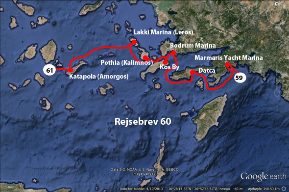 ”De sidste skal blive de første!” Det passer meget godt på den måde, at Amorgos var den sidste ø i Kykladerne i efteråret for vort vedkommende – og det er den første i dette forår. Så det første rejsebrev i 2013 forfatter vi her på denne imposante ø. Der har været fin sigt på vandet i dag i modsætning til de øvrige dage, så vi kunne næsten se de høje klipper allerede, da vi kom ud af bugten ved Leros; afstanden er ca. 45 sm.